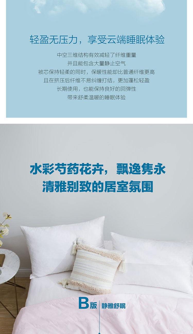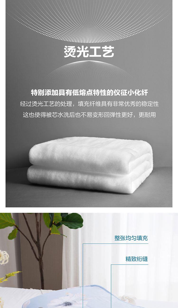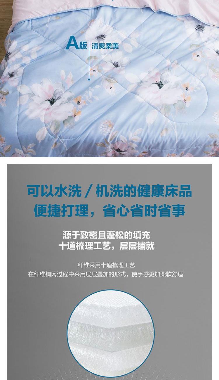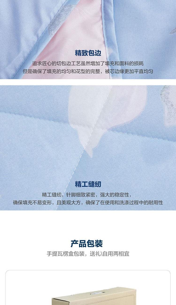 面料材质:聚酯纤维 填充材质: 50%聚乙烯醇纤维(含大豆蛋白)+50%聚酯纤维规格尺寸:150*200cm 填充重量:228g 外箱尺寸: 54*44*76cm