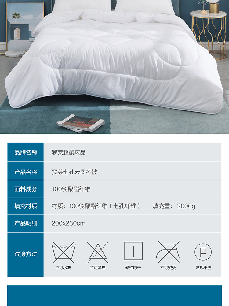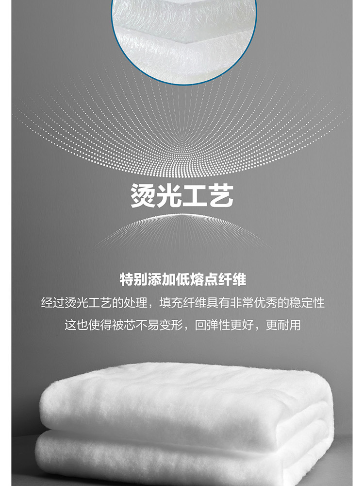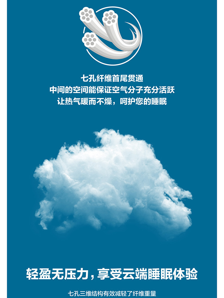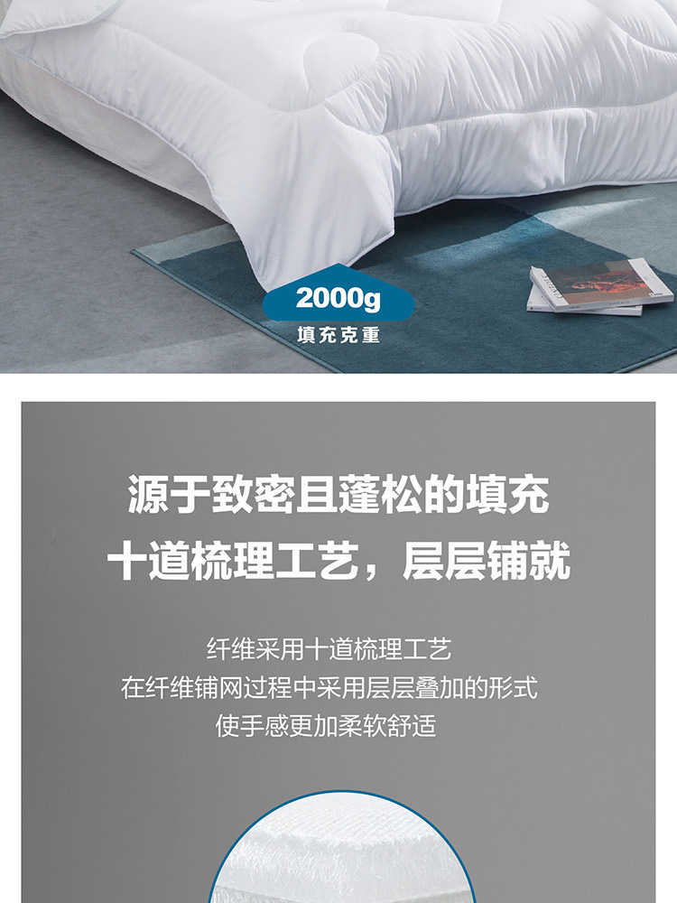 面料材质:聚酯纤维 填充材质:聚酯纤维(含30%七孔纤维) 规格尺寸:200*230cm 填充重量:2000g 采用桃皮绒磨毛压花面料,表面附有细密的绒毛,手感绵密,亲肤舒适; 填充优质七孔纤维,藕形七孔结构设计,孔形完整、壁厚均匀,将多孔和三维卷曲的优势相结合,松回弹好,增强了纤维的抱合力,保暖更好;其他纤维比,蓬松度,保暖性,及耐用性综合指数佳。