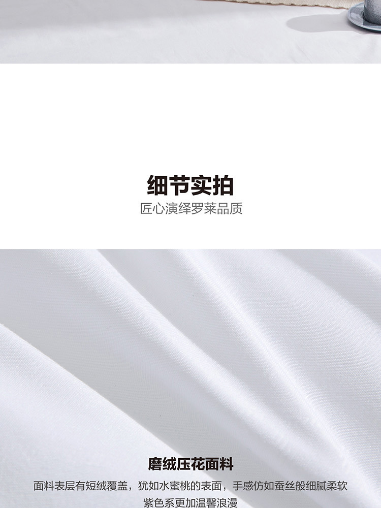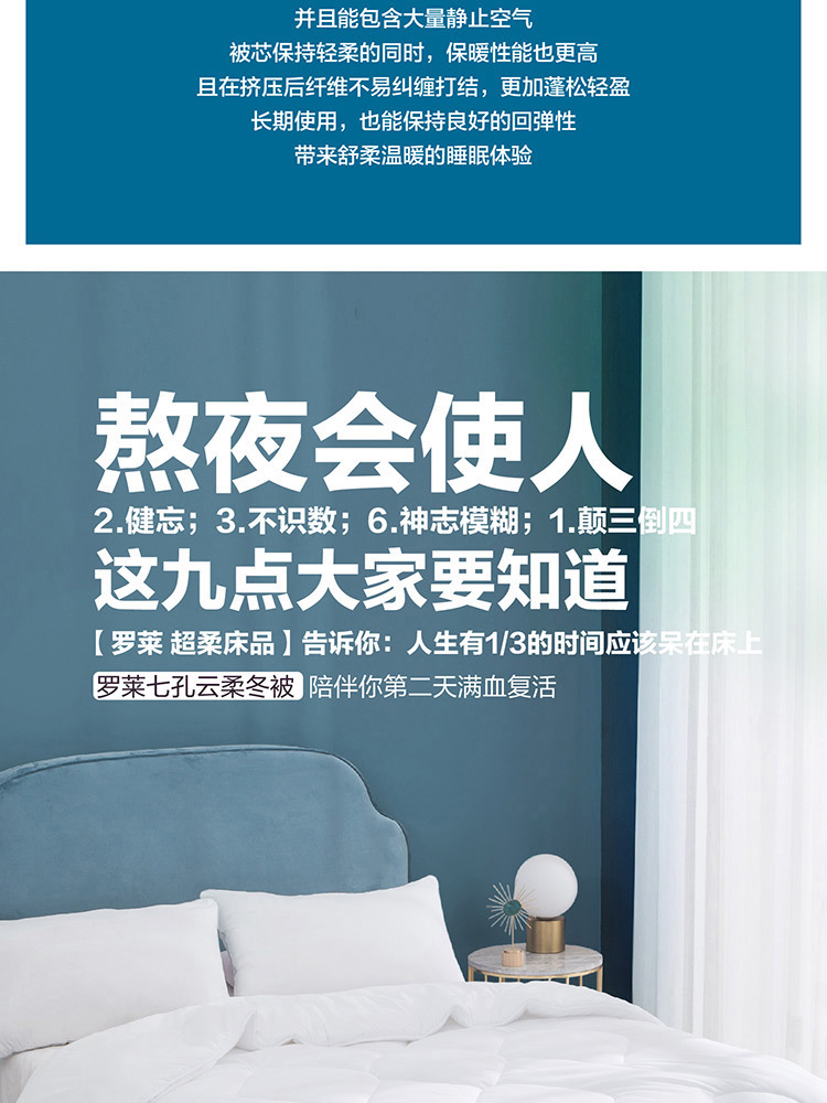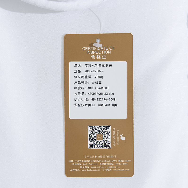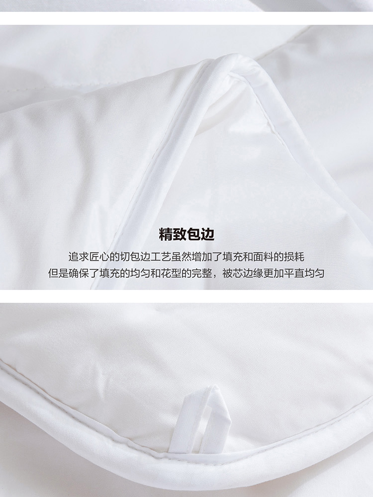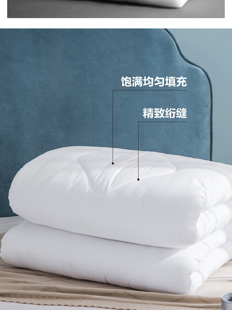 面料材质:聚酯纤维 填充材质:聚酯纤维(含30%七孔纤维) 规格尺寸:200*230cm 填充重量:2000g 采用桃皮绒磨毛压花面料,表面附有细密的绒毛,手感绵密,亲肤舒适; 填充优质七孔纤维,藕形七孔结构设计,孔形完整、壁厚均匀,将多孔和三维卷曲的优势相结合,松回弹好,增强了纤维的抱合力,保暖更好;其他纤维比,蓬松度,保暖性,及耐用性综合指数佳。