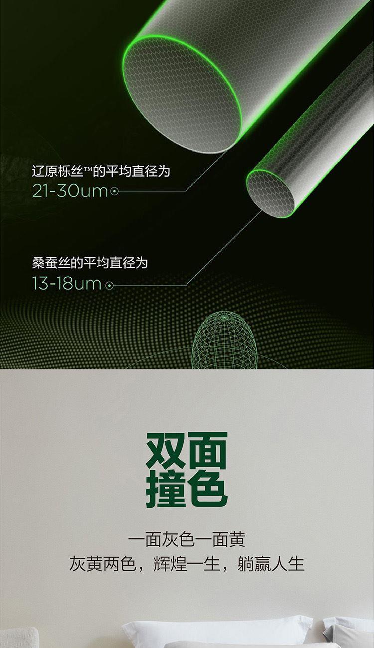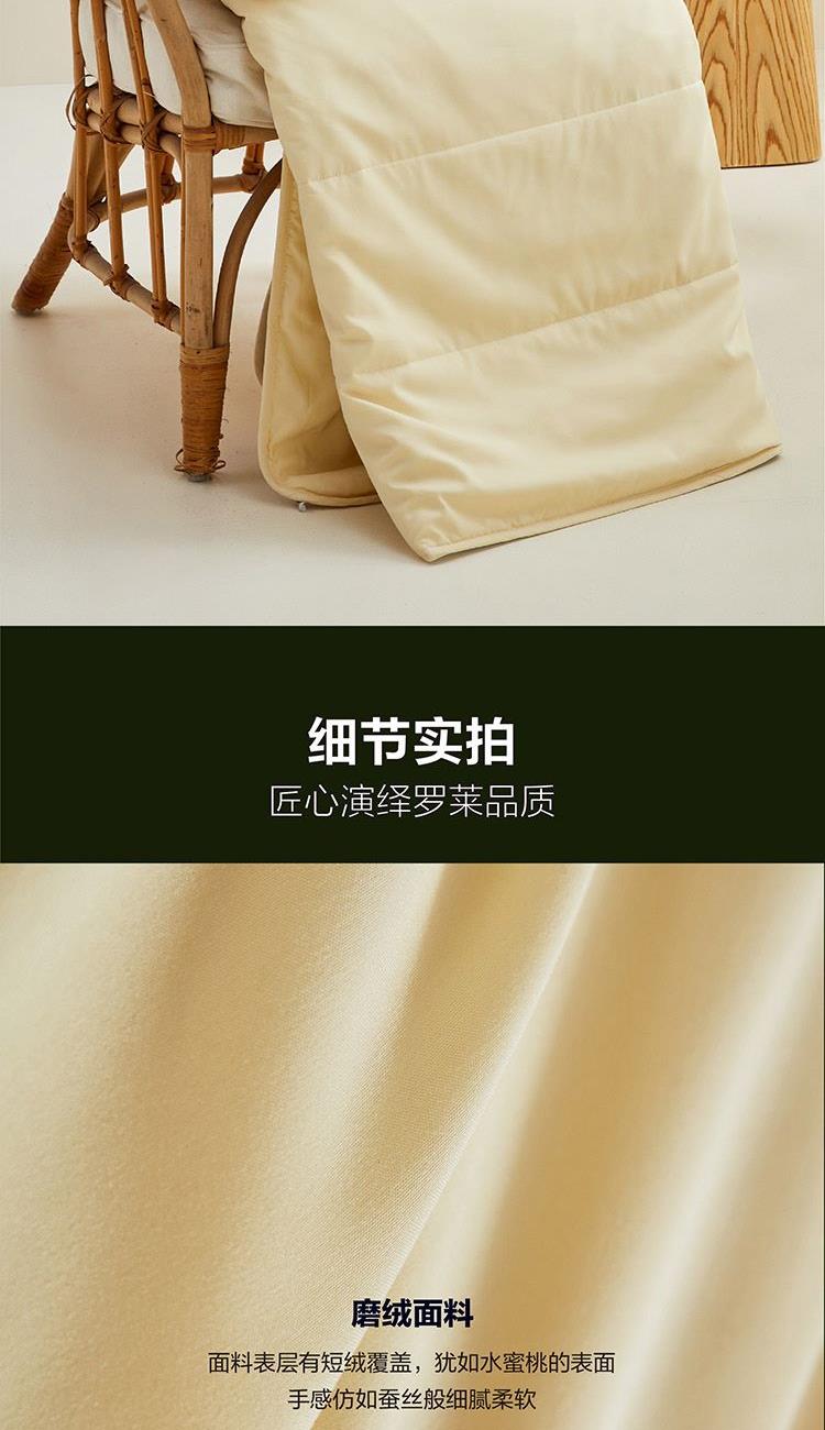 采用桃皮绒磨毛面料,表面附有细密的绒毛,手感绵密,亲肤舒适;“灰黄”配色,寓意“”“辉煌腾达”; 填充采用罗莱专属天然蚕丝—辽原栎丝™ ,精选天然优质野生蚕茧,长白山云脉滋养,蚕茧精选8g/粒的上品茧,是普通茧的1.6倍,出丝率更高,更蓬松;纤维截面1/3为毛细孔,丝容积空隙大,空气自由贯穿,温而不燥,更透气。