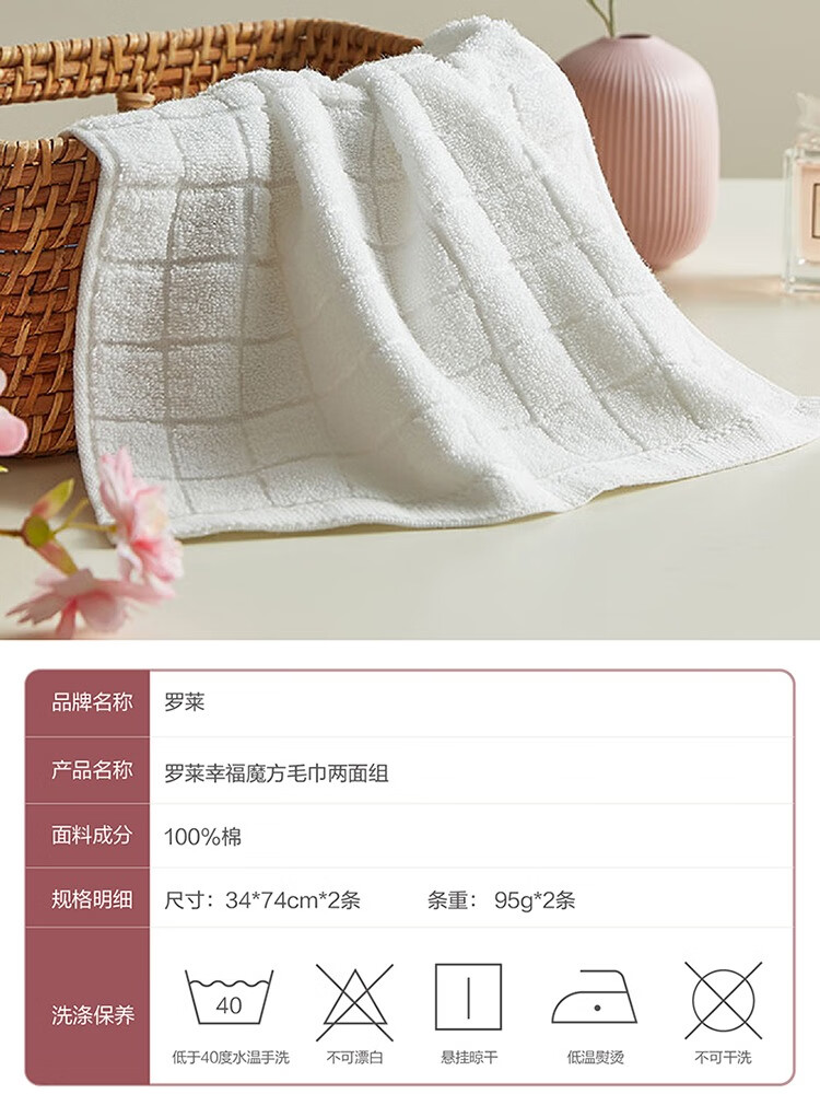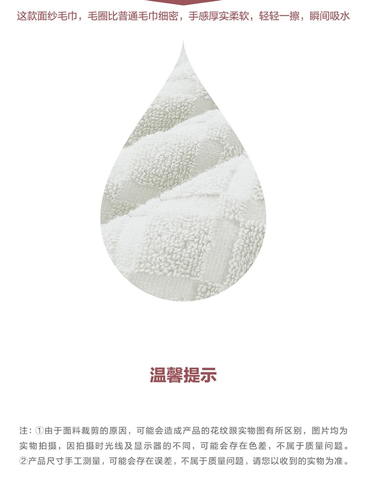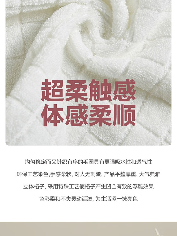 面料材质:纯棉 规格尺寸:34×74cm×2条 产品重量:95g 产品包装:TG-ZW001-1天地盖礼盒,21.5*21.5*5CM 外箱尺寸: 66×52×45cm 采用全棉纱线,有捻工艺,毛圈绵密,手感绵柔厚实,吸水性好,不易掉毛,耐用性好; 立体格子造型,采用特殊工艺使得图案产生凹凸有致的浮雕效果,时尚感十足 两条面巾的组合装,经济实用