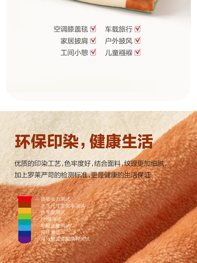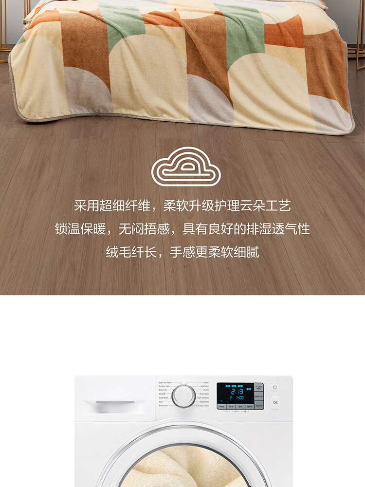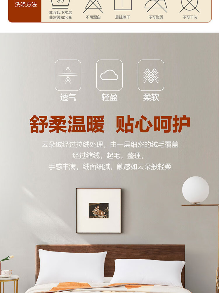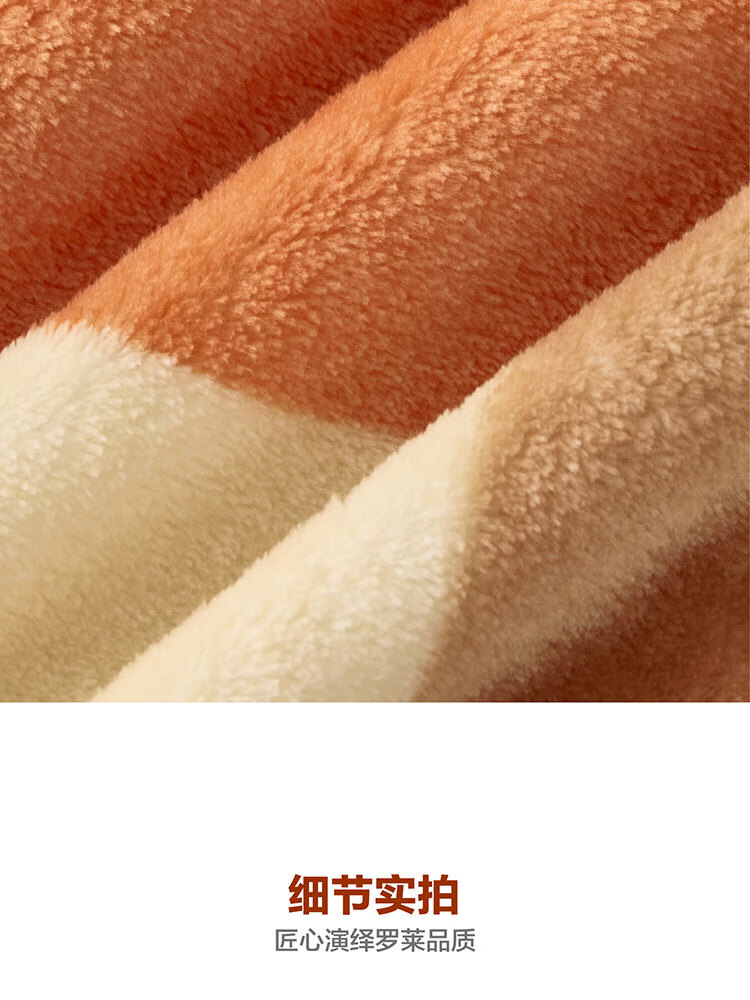 面料材质:聚酯纤维 规格尺寸:150×200cm×280GSM 产品条重:840g 外箱尺寸: 42×37×76cm(参考) 采用超细纤维,柔软升级护理云朵工艺,锁温保暖,无闷捂感,具有良好的排湿透气性,绒毛纤长,手感更柔软细腻,保暖性好,光泽度高;