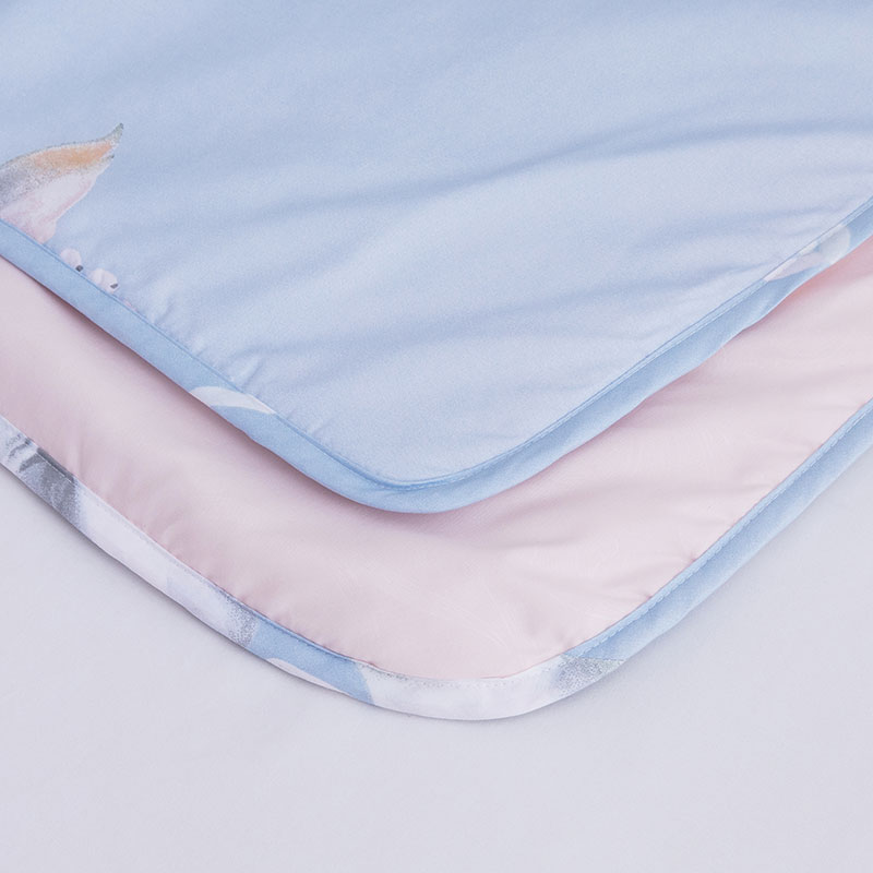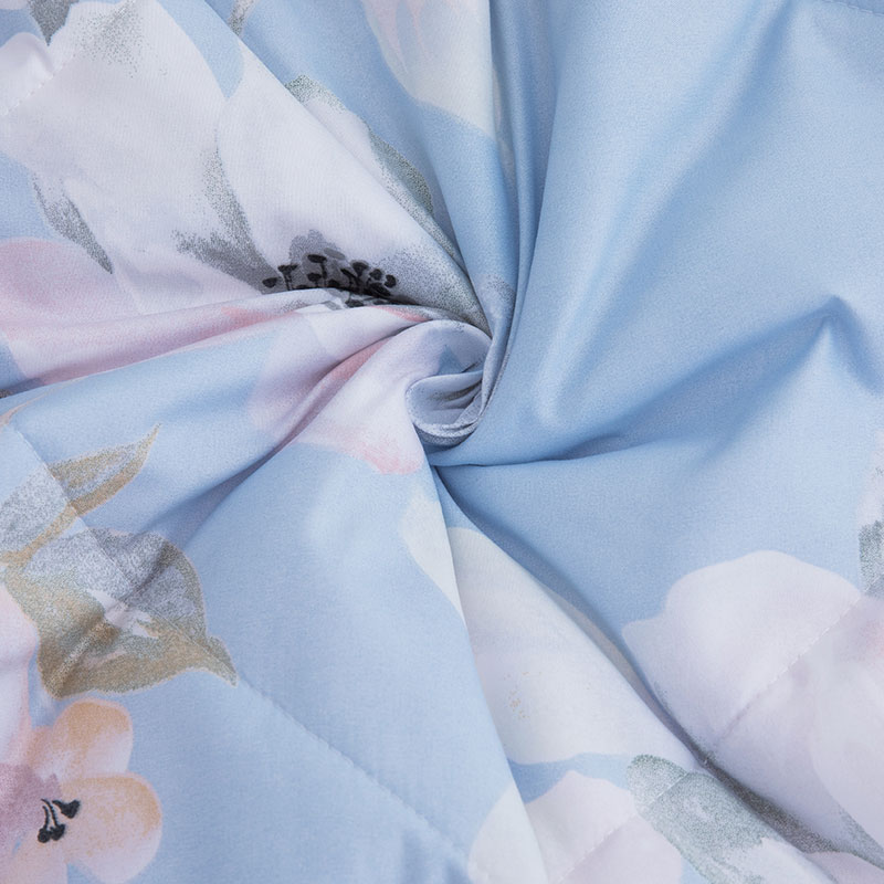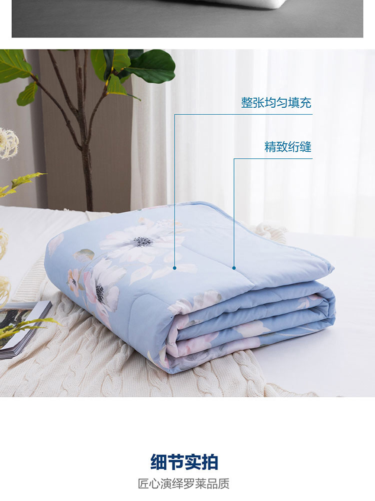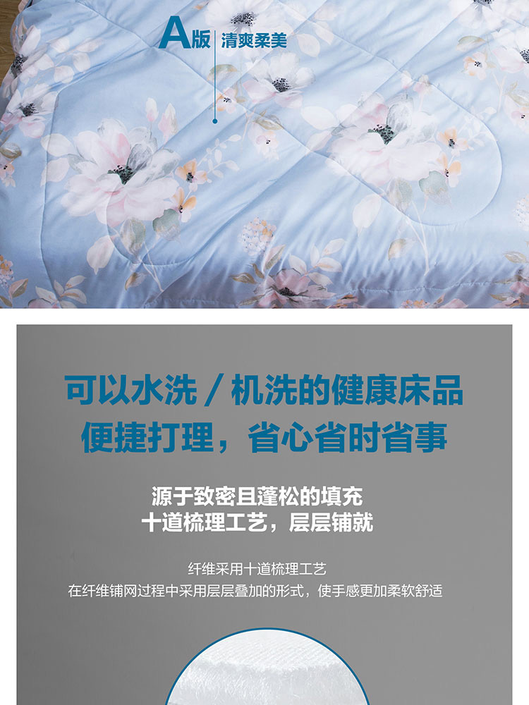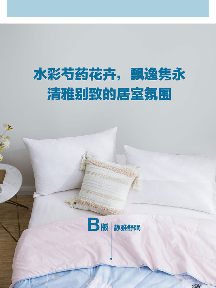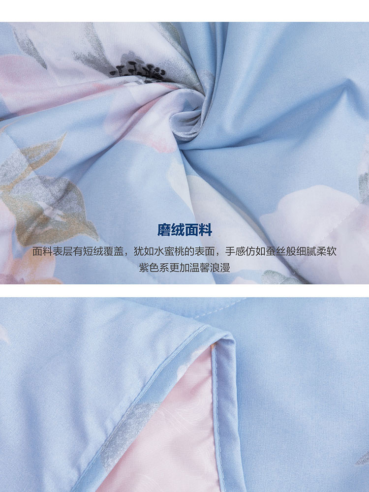 面料材质:聚酯纤维 填充材质:聚酯纤维 规格尺寸:150*200cm 填充重量:228g 外箱尺寸: 54*44*76cm 采用桃皮绒面料,表面附有细密的绒毛,手感绵密,亲肤舒适; 填充中空纤维,经过精细配棉、开松、铺棉等多道工序加工而成,采用层层叠加的形式手感更加的柔软舒适,后道烫光工艺使得被芯更加不容易跑毛,更加经久耐用; 设计师以芍药花为主要元素,搭配浅蓝底色,清新自然。