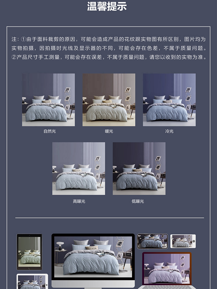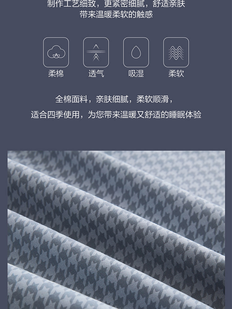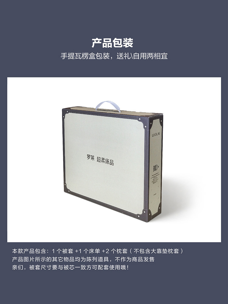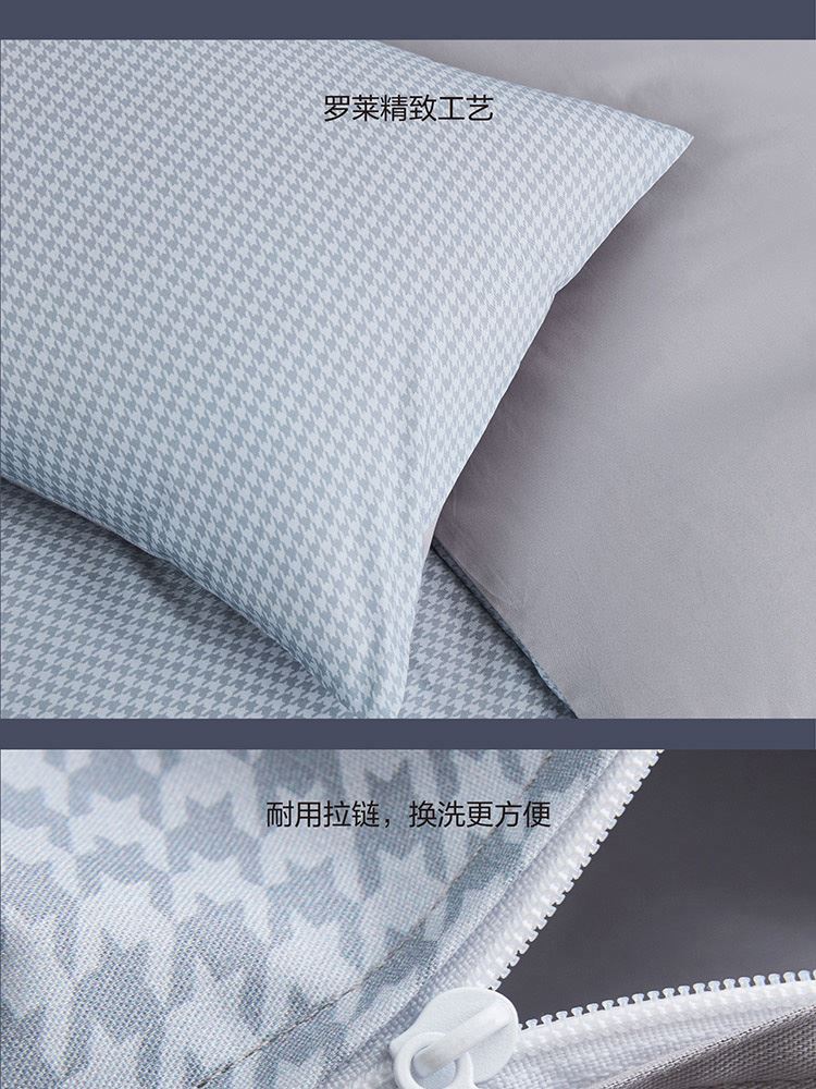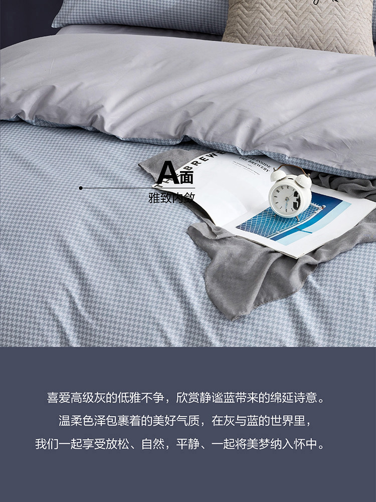 规格尺寸:枕套:48*74cmX2 被套:200*230cmX1 床单:230*240cmX1 外箱尺寸:54*42*38 cm 灰的低雅不争,在灰与蓝的世界里,我们一起享受放松、自然,平静、一起将美梦纳入怀中。城市悦享能够实现你对美好生活的所有愿想,B版的那抹静谧灰,给我们带来了无尽的绵延诗意与遐想。