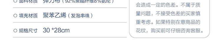 面料材质:92%聚酯纤维8%氨纶 填充主体材质:聚苯乙烯(发泡串珠) 规格尺寸:30×28cm 外箱尺寸: 53×42×62cm 海豹造型活泼可爱,充满萌趣,手感柔软亲肤;