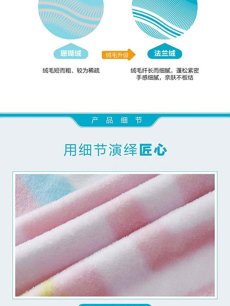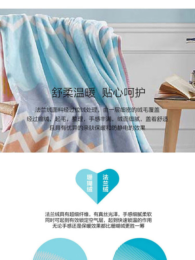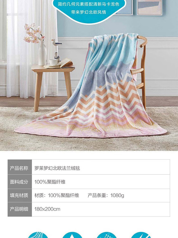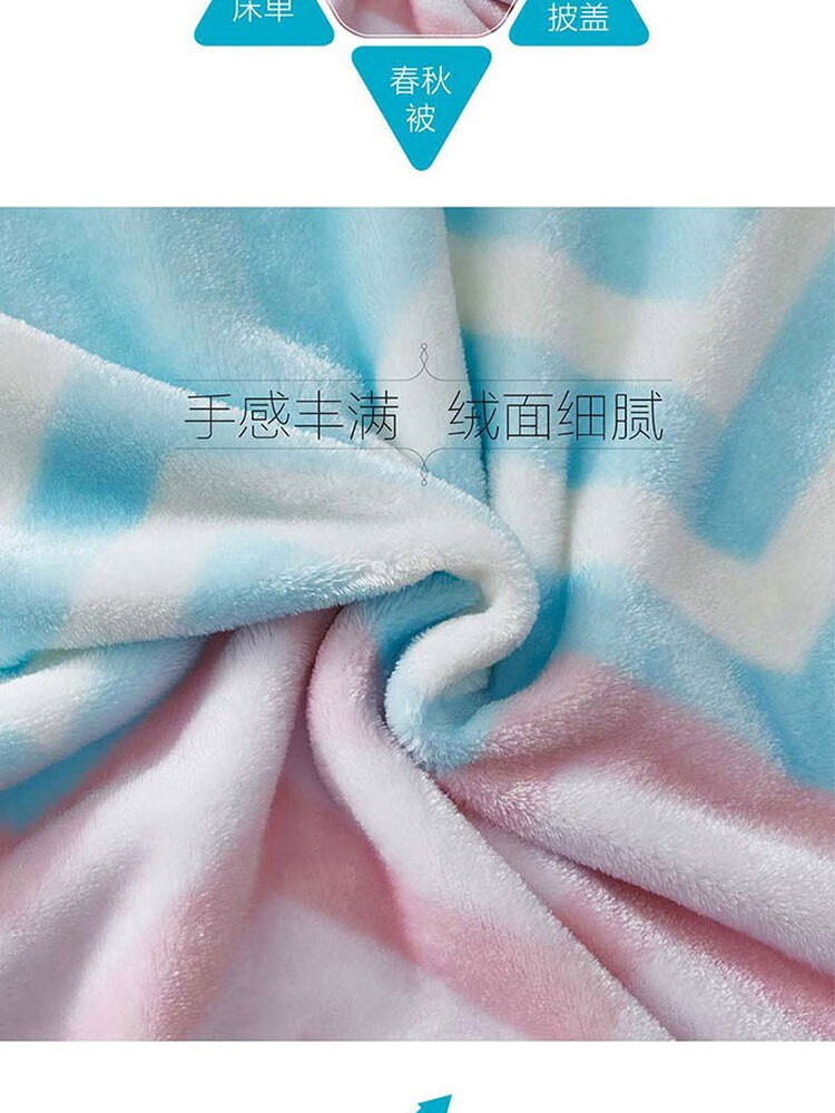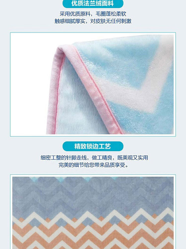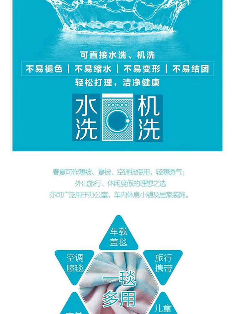 面料材质:聚酯纤维 规格尺寸:180×200cm 产品条重:1080g 外箱尺寸: 42×37×76cm(参考) 采用超细纤维,具有良好的排湿透气性,绒毛纤长,手感柔软细腻,保暖性好,光泽度高; 简约几何元素搭配清新马卡龙色,带来梦幻般的北欧风情; 可作薄被、夏被、空调被、床单、盖毯使用;广泛用于办公室,外出、小憩及居家装饰。