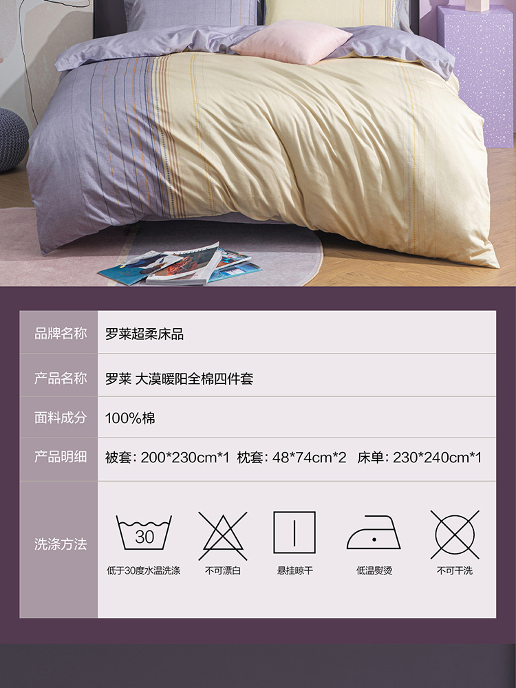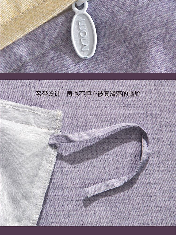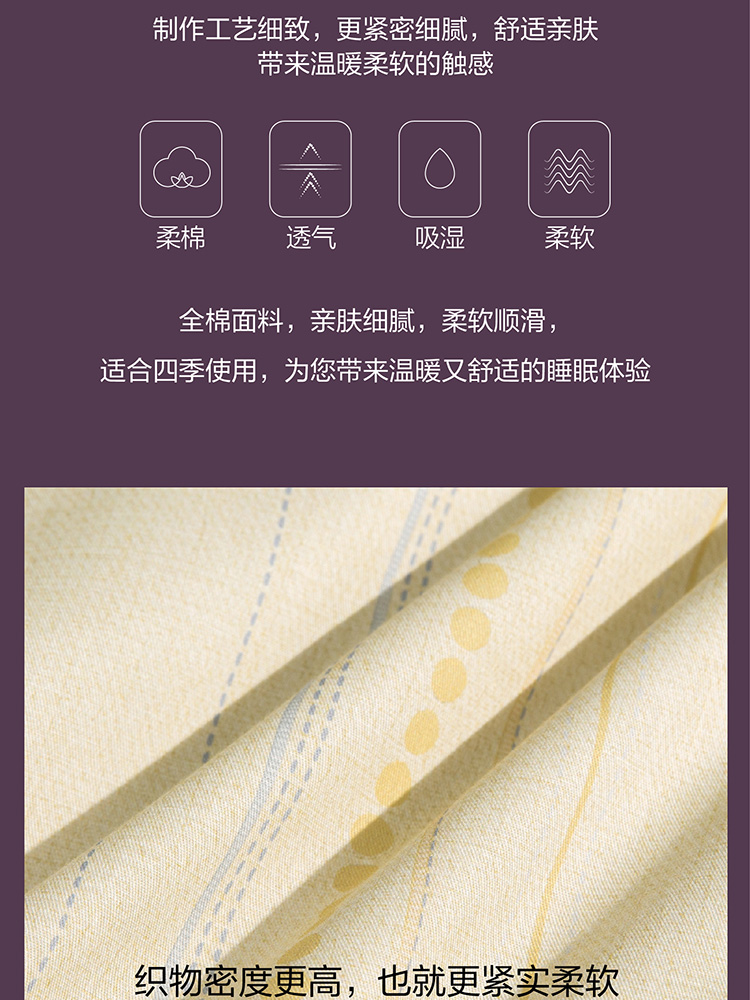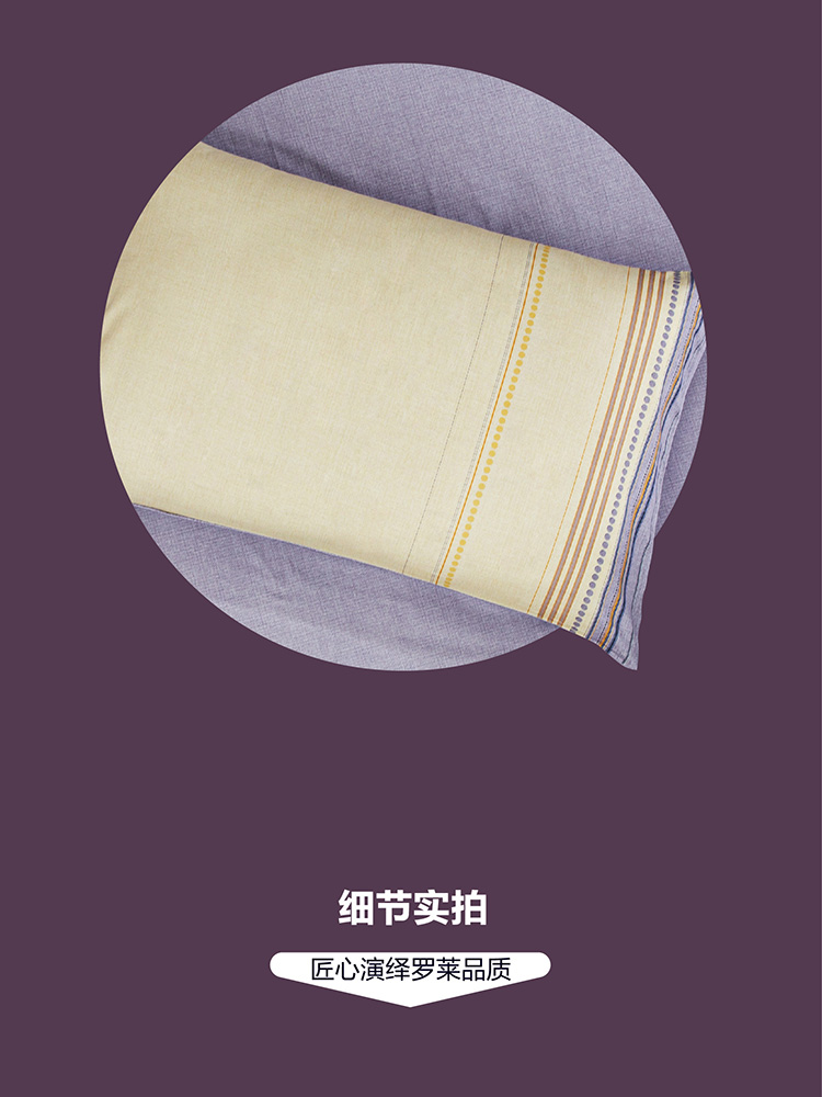 规格尺寸:枕套:48*74cmX2 被套:200*230cmX1 床单:230*240cmX1 外箱尺寸:54*42*38 cm 现代的生活节奏快,生活应该是充满阳光,带点精致,条条道路通罗马,解决问题也不止一条路。 介绍:1.黄色代表着阳光,紫灰色代表着沉稳,沉着;2,采用了比较细腻的条纹,点点等简单的元素,简单,代表着轻松,精致的细节,代表着生活态度。