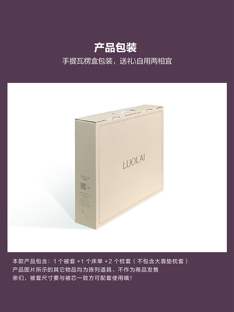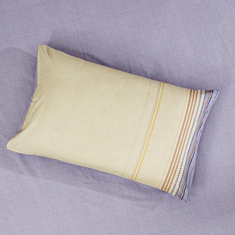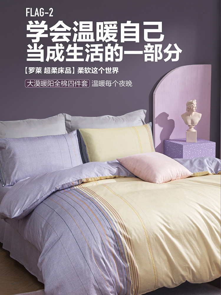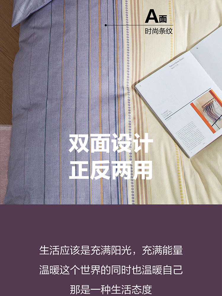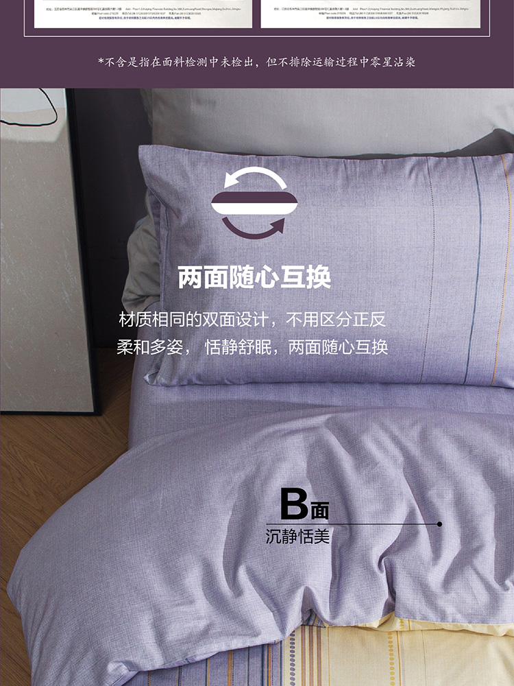 规格尺寸:枕套:48*74cmX2 被套:200*230cmX1 床单:230*240cmX1 外箱尺寸:54*42*38 cm 现代的生活节奏快,生活应该是充满阳光,带点精致,条条道路通罗马,解决问题也不止一条路。 介绍:1.黄色代表着阳光,紫灰色代表着沉稳,沉着;2,采用了比较细腻的条纹,点点等简单的元素,简单,代表着轻松,精致的细节,代表着生活态度。