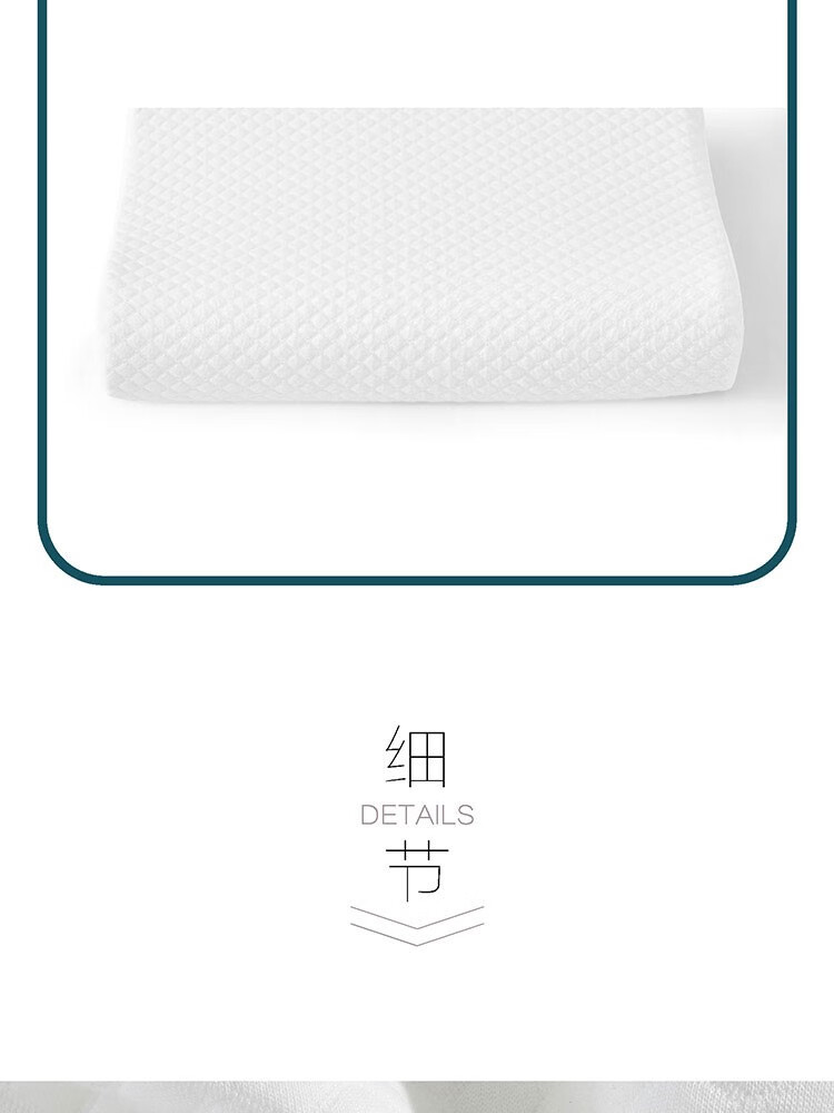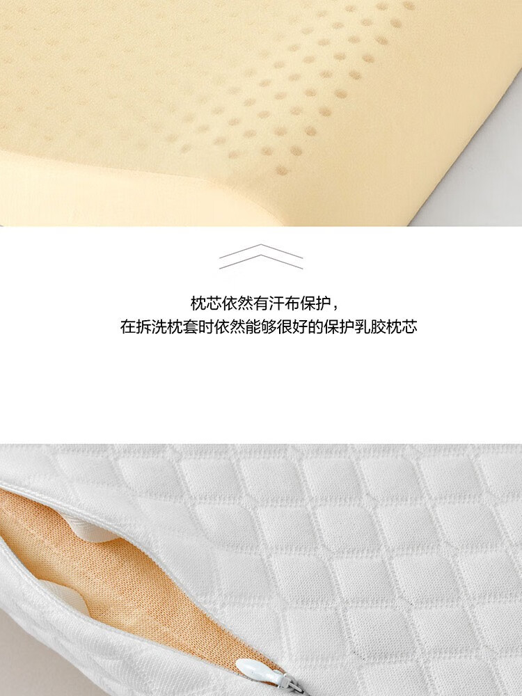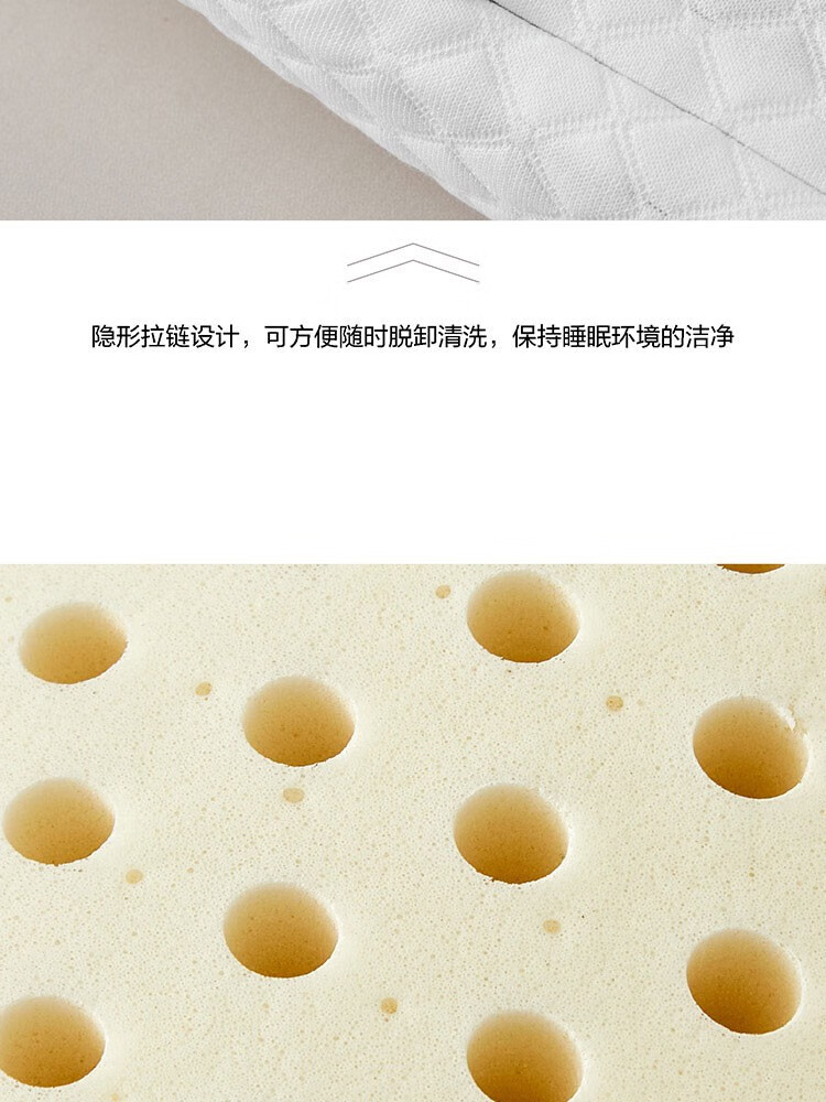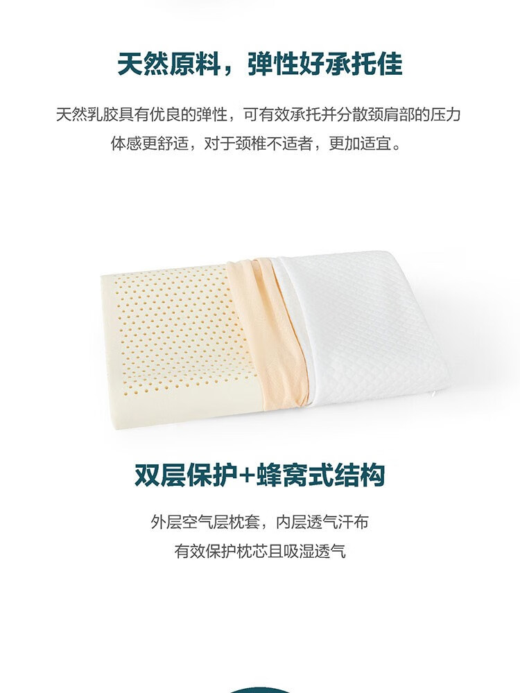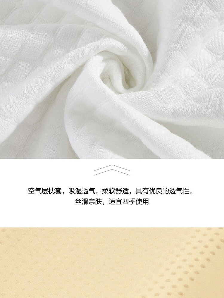 面料材质:空气层面料:聚酯纤维 里料:聚酯纤维 填充材质:乳胶(聚异戊二烯含量90%) (乳胶原浆泰国进口) 规格尺寸:36*60*10/8cm 填充重量:1000g 空气层枕套,吸湿透气,柔软舒适,具有优良的透气性,丝滑亲肤,适宜四季使用。 内填充乳胶枕芯,回弹性好,透气性佳,枕芯按摩颗粒牵引保护,在睡眠中就可享受舒适按摩; 枕芯两边高中低造型,无论侧睡还是仰睡,都能够紧密贴合人体的肩部、颈部和头部,起到良好的承托作用。