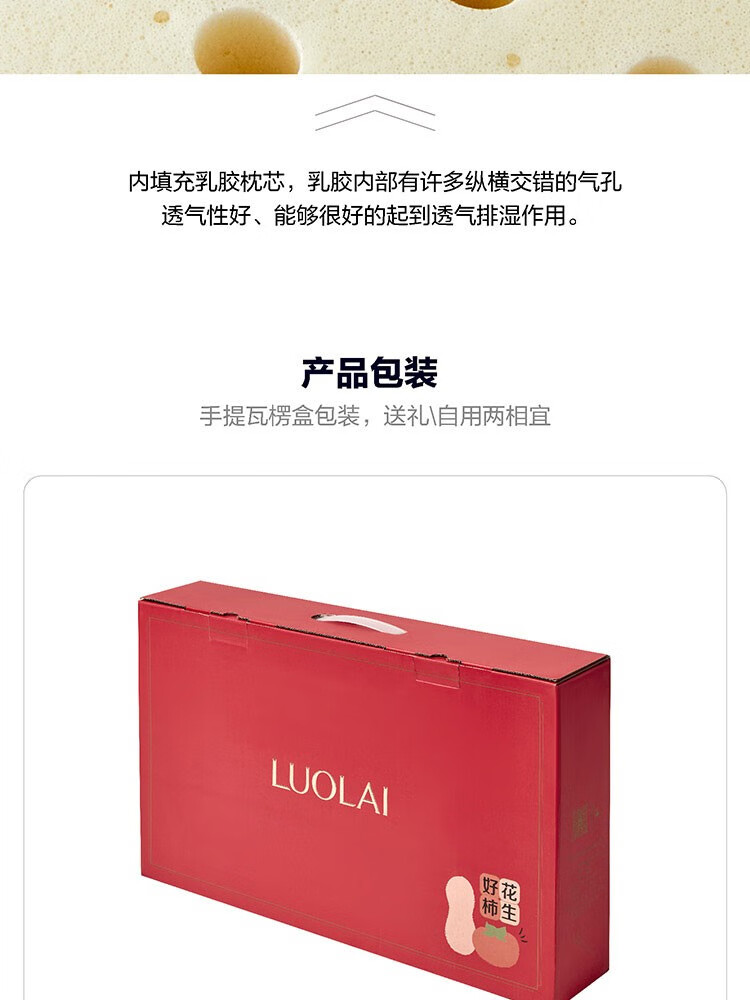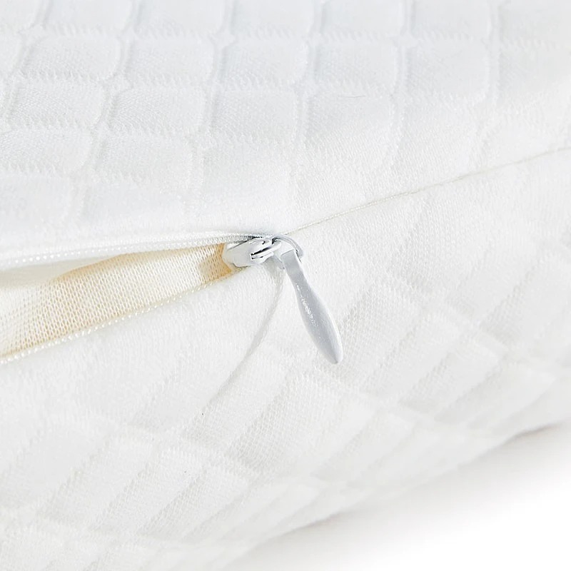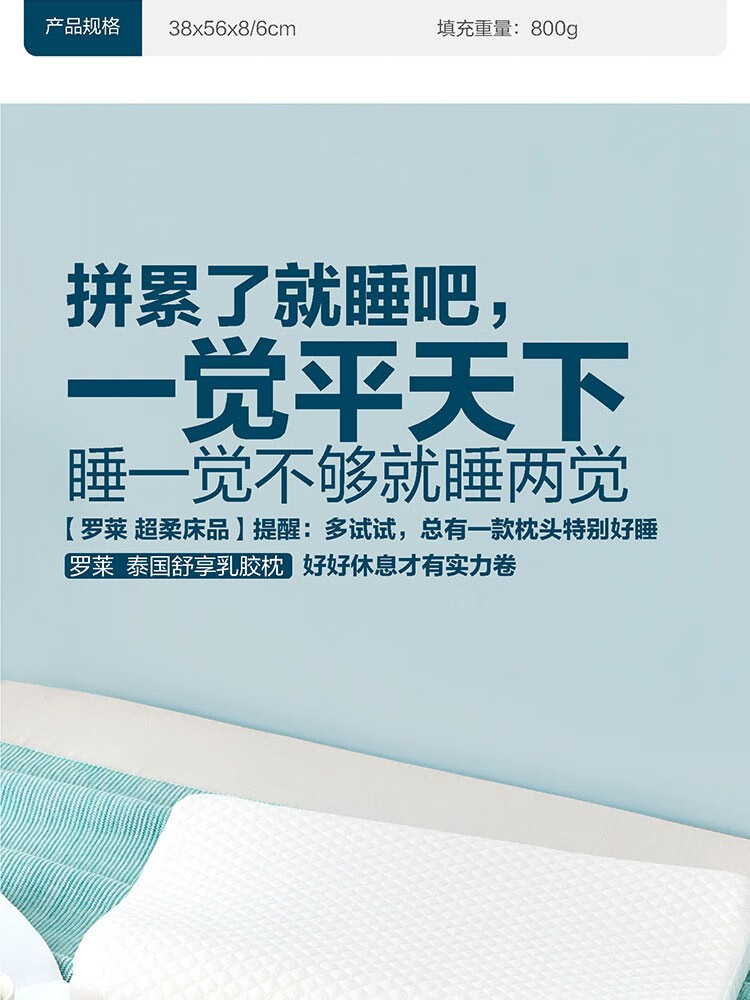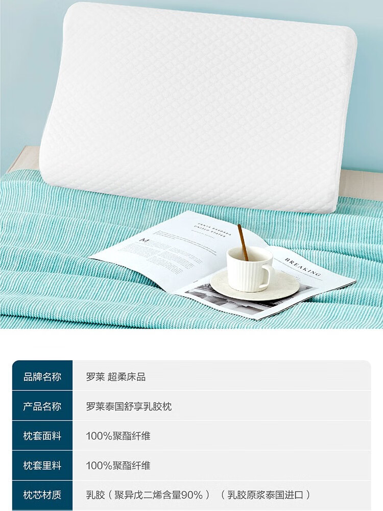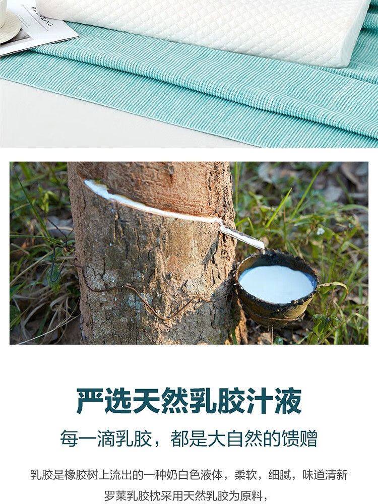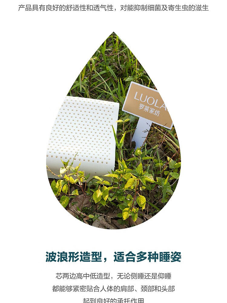 面料材质:空气层面料:聚酯纤维 里料:聚酯纤维 填充材质:乳胶(聚异戊二烯含量90%) (乳胶原浆泰国进口) 规格尺寸:36*60*10/8cm 填充重量:1000g 空气层枕套,吸湿透气,柔软舒适,具有优良的透气性,丝滑亲肤,适宜四季使用。 内填充乳胶枕芯,回弹性好,透气性佳,枕芯按摩颗粒牵引保护,在睡眠中就可享受舒适按摩; 枕芯两边高中低造型,无论侧睡还是仰睡,都能够紧密贴合人体的肩部、颈部和头部,起到良好的承托作用。