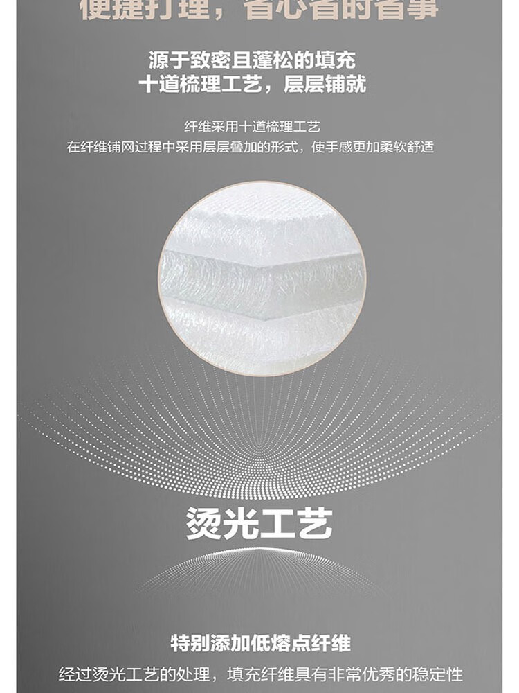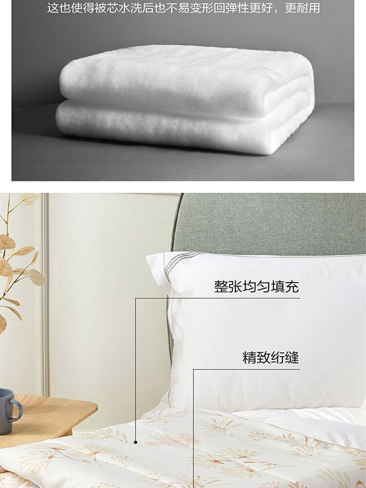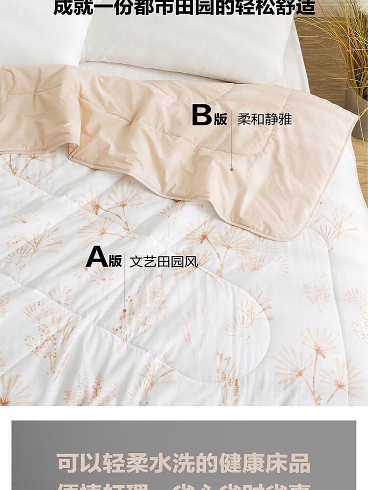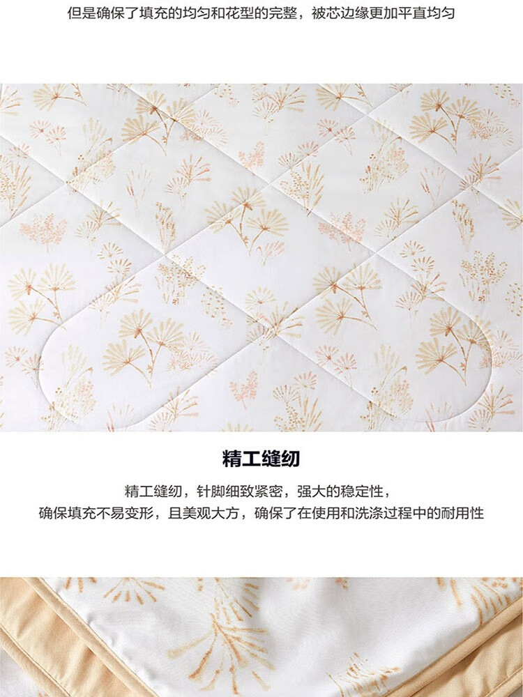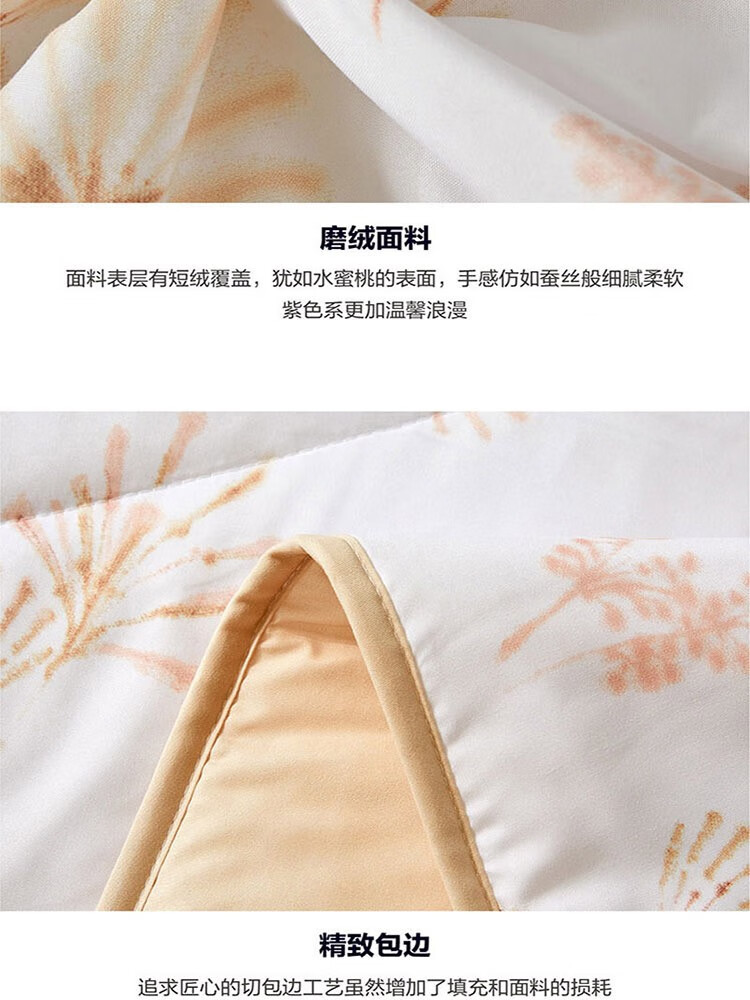 采用桃皮绒面料,表面附有细密的绒毛,手感绵密,亲肤舒适; 特别填充防螨纤维, 可有效抑大肠杆菌,金色葡萄球菌和白色念珠菌等细菌的繁殖,在抑制螨虫再生和繁殖方面也有突出的优势,呵护家人健康; 轻盈的蒲公英搭配米橘色阳光色调,浓郁的文艺风,轻松营造都市田园睡眠氛围。