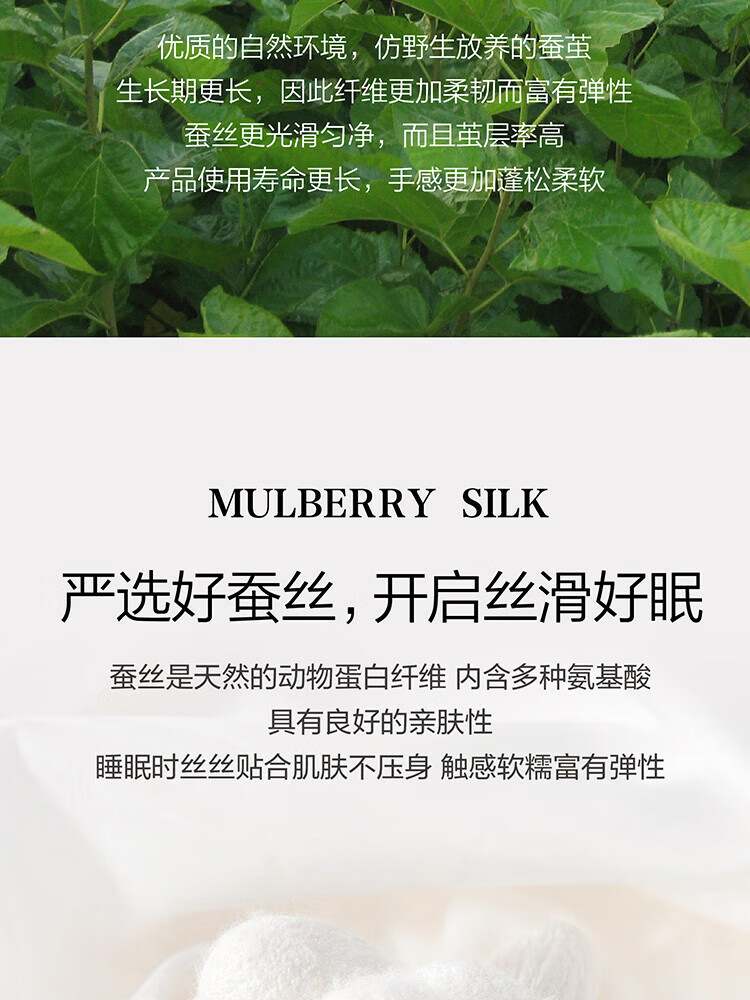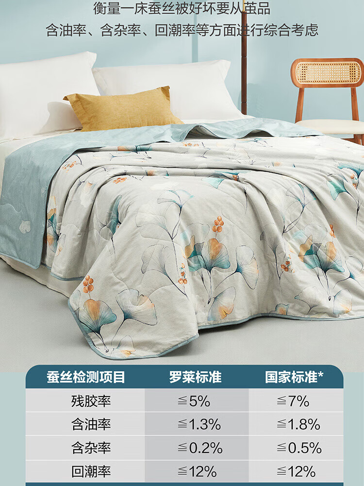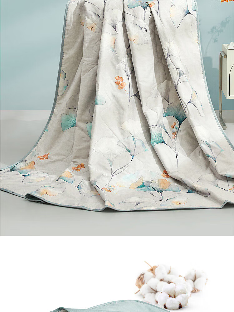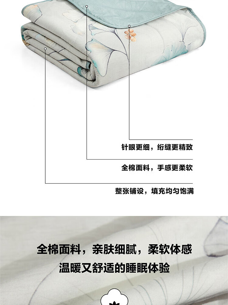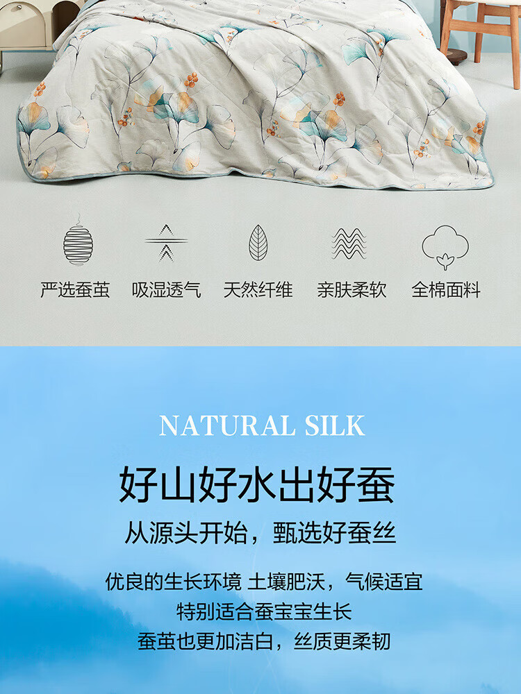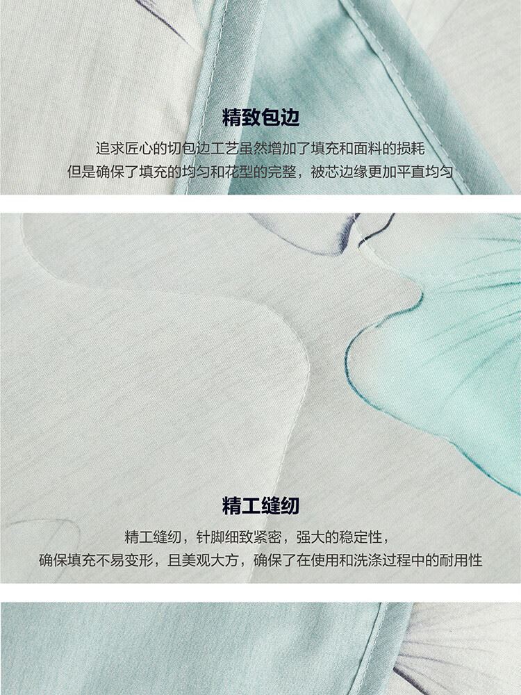 纯棉面料, 柔软亲肤, 具有良好的吸湿透气性,体感舒适; 填充采用柞蚕丝,吸湿能力大于棉, 体感舒爽 ,优质柞蚕丝内部结构呈现多孔性,且空隙率比桑蚕丝高出一倍,同比重柞蚕丝体积高于桑蚕丝20%左右,因此长期使用仍能保持原有的蓬松度。 寓意吉祥的银杏,象征着幸运、美满、幸福,在花型的塑造上,采用了工笔画,呈现出轻灵飘逸的姿态。 "