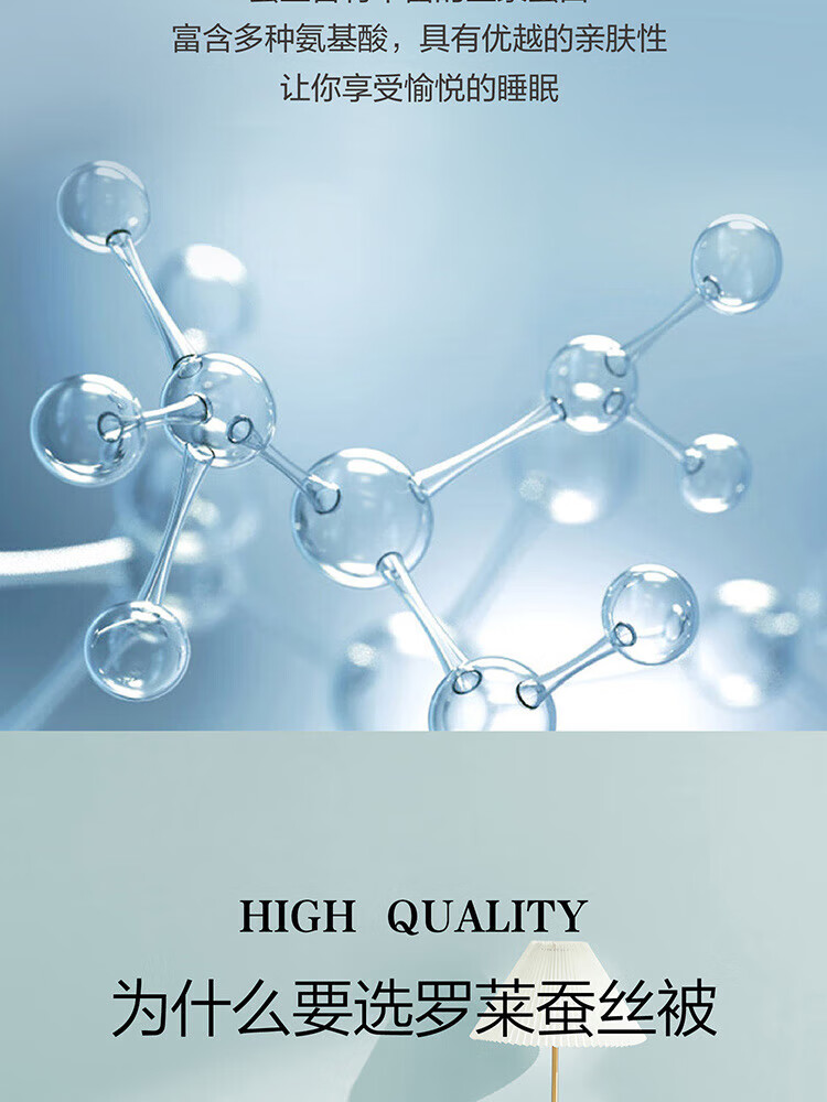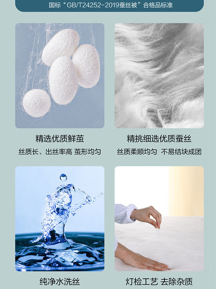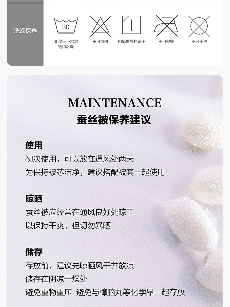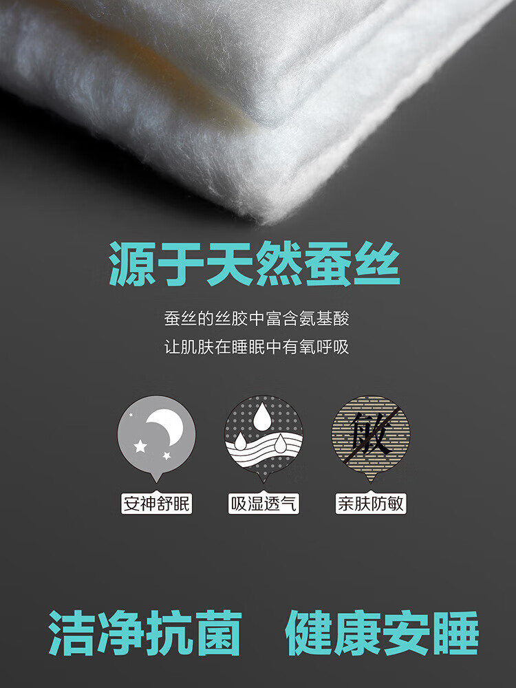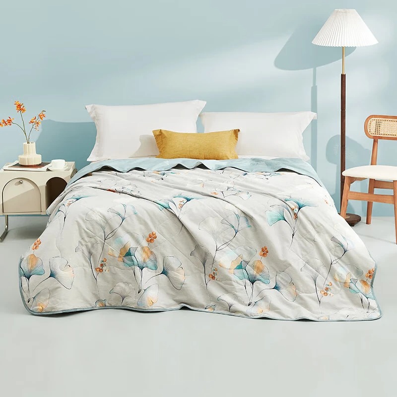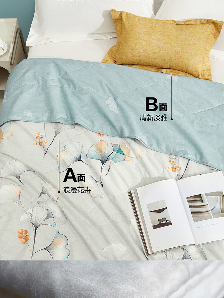 纯棉面料, 柔软亲肤, 具有良好的吸湿透气性,体感舒适; 填充采用柞蚕丝,吸湿能力大于棉, 体感舒爽 ,优质柞蚕丝内部结构呈现多孔性,且空隙率比桑蚕丝高出一倍,同比重柞蚕丝体积高于桑蚕丝20%左右,因此长期使用仍能保持原有的蓬松度。 寓意吉祥的银杏,象征着幸运、美满、幸福,在花型的塑造上,采用了工笔画,呈现出轻灵飘逸的姿态。 "