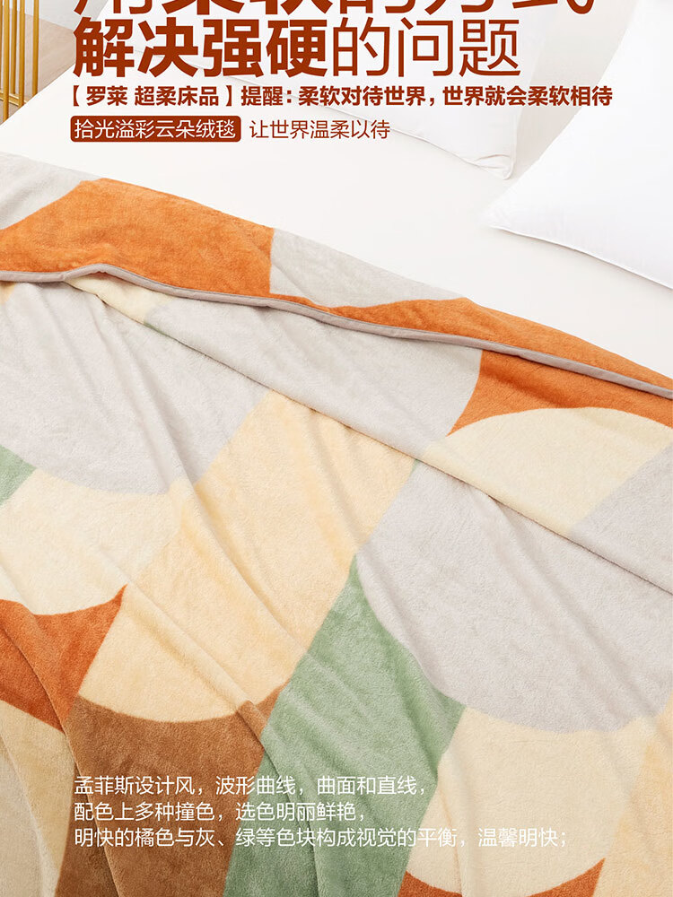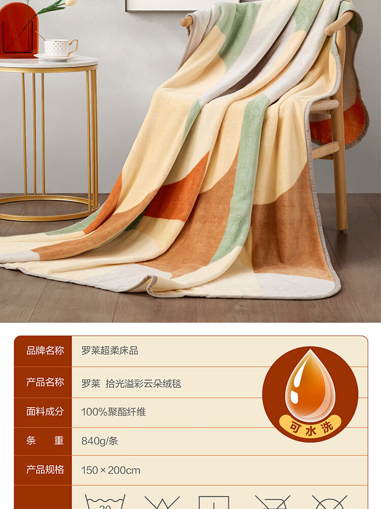 面料材质:聚酯纤维 规格尺寸:180×200cm×280GSM 产品条重:1008g 外箱尺寸: 42×37×76cm(参考) 采用超细纤维,柔软升级护理云朵工艺,锁温保暖,无闷捂感,具有良好的排湿透气性,绒毛纤长,手感更柔软细腻,保暖性好,光泽度高;