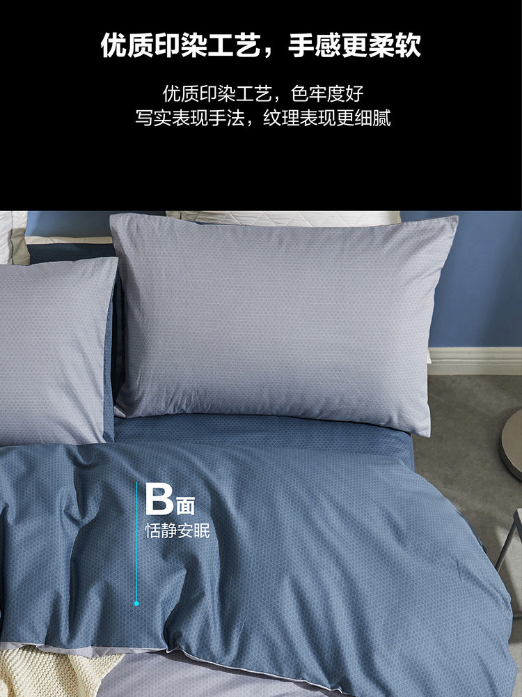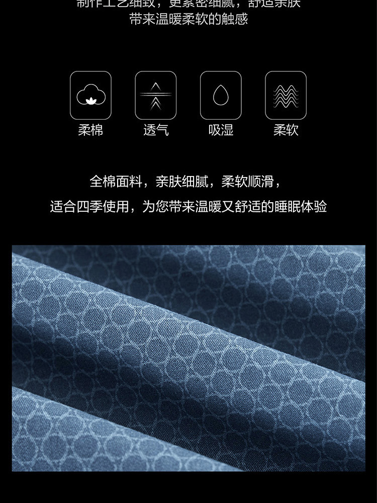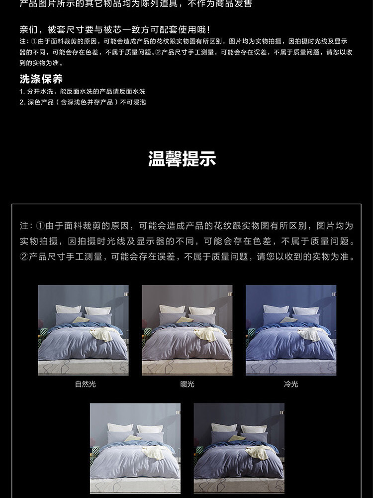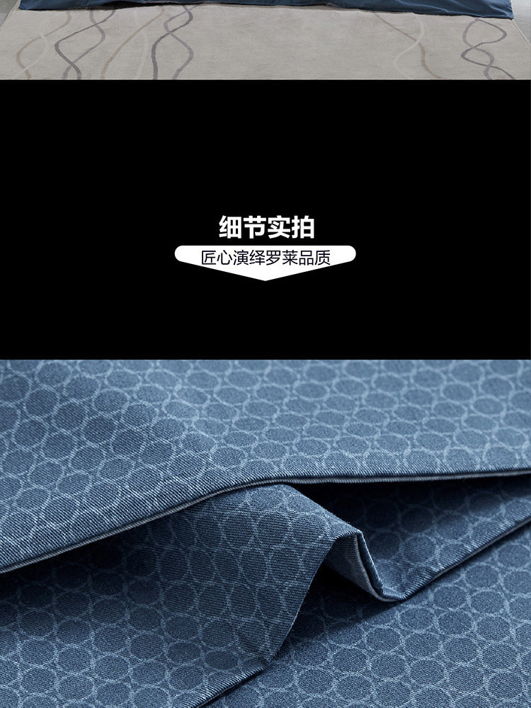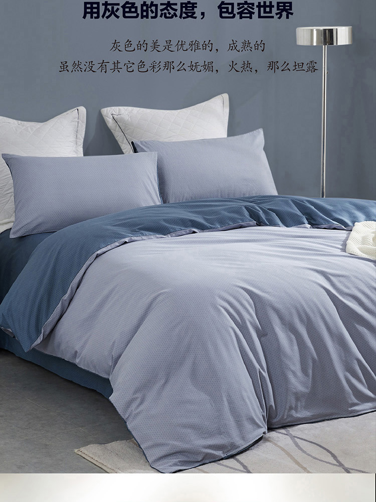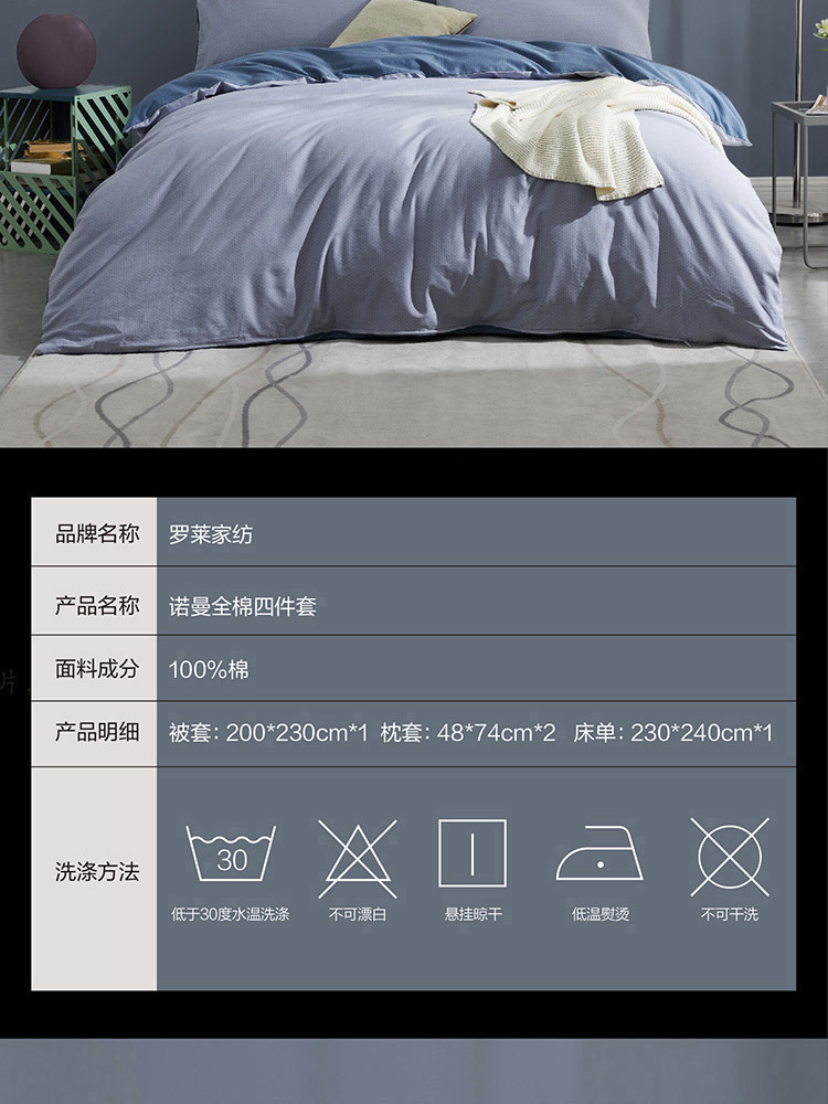 规格尺寸:枕套:48*74cmX2 被套:200*230cmX1 床单:230*240cmX1 外箱尺寸:54*42*38 cm 诺曼的美是优雅的,成熟的,它不像红色那么妩媚,火热,又不像绚烂色彩那么坦露,它像画屏,轻罗小扇扑流萤,天阶夜色凉如水,卧看牵牛织女星。
