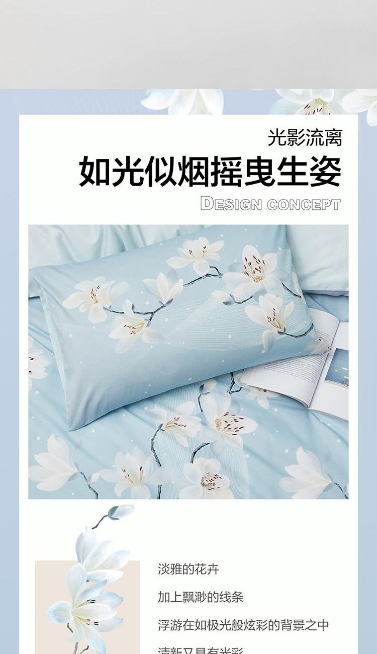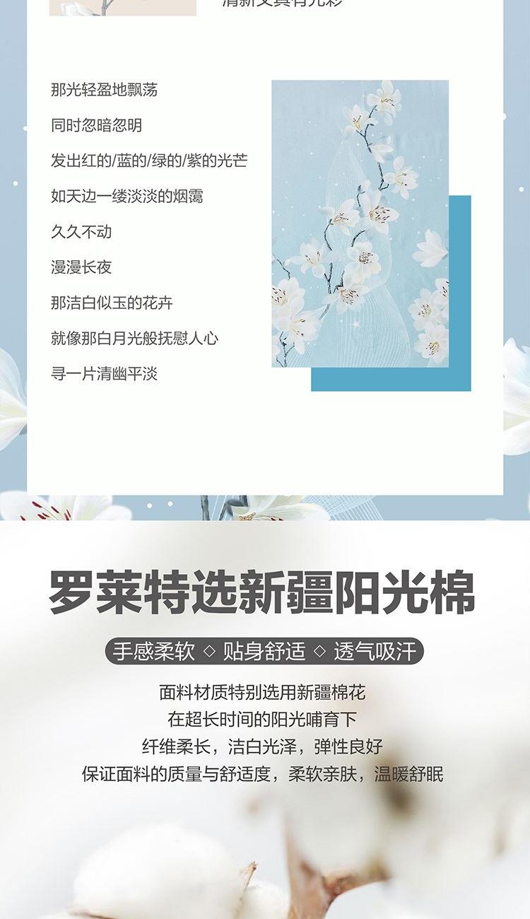 淡雅的花卉,加上飘渺的线条,浮游在如极光般炫彩的背景之中,清新又具有光彩。那极光轻盈地飘荡,同时忽暗忽明,发出红的、蓝的、绿的、紫的光芒,有时又象天边一缕淡淡的烟霭,久久不动。漫漫长夜,那洁白似玉的花卉,就像那白月光般抚慰人心,在芬芳的世界里,寻一片清幽平淡。